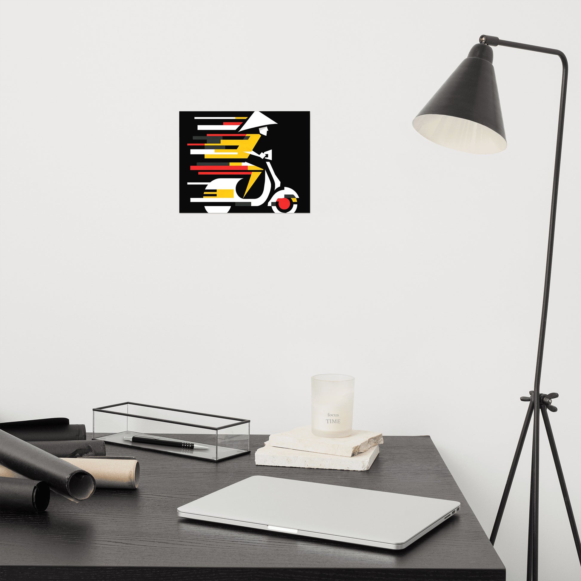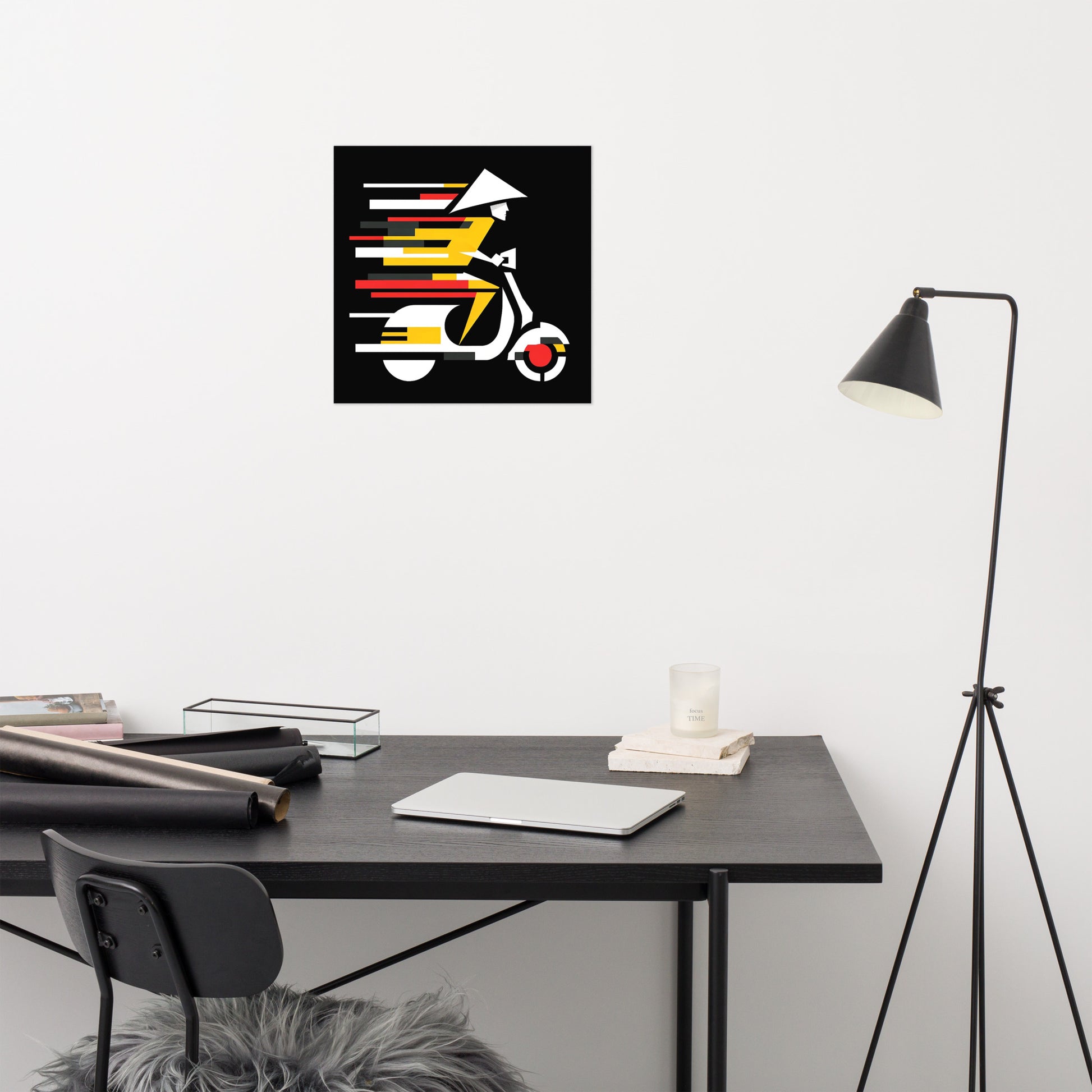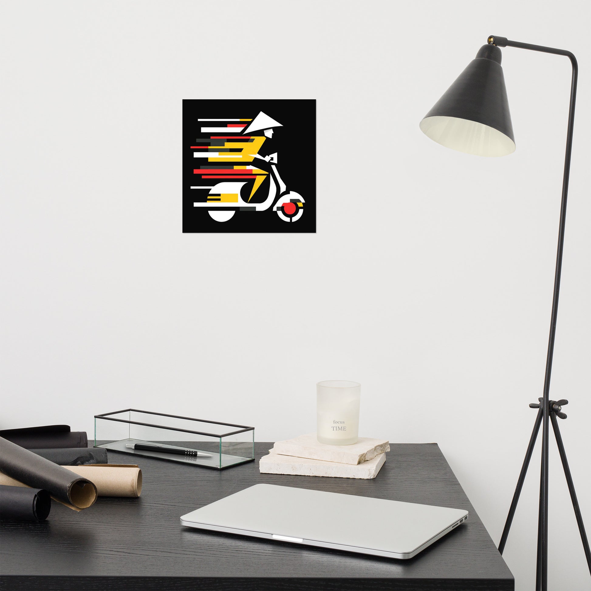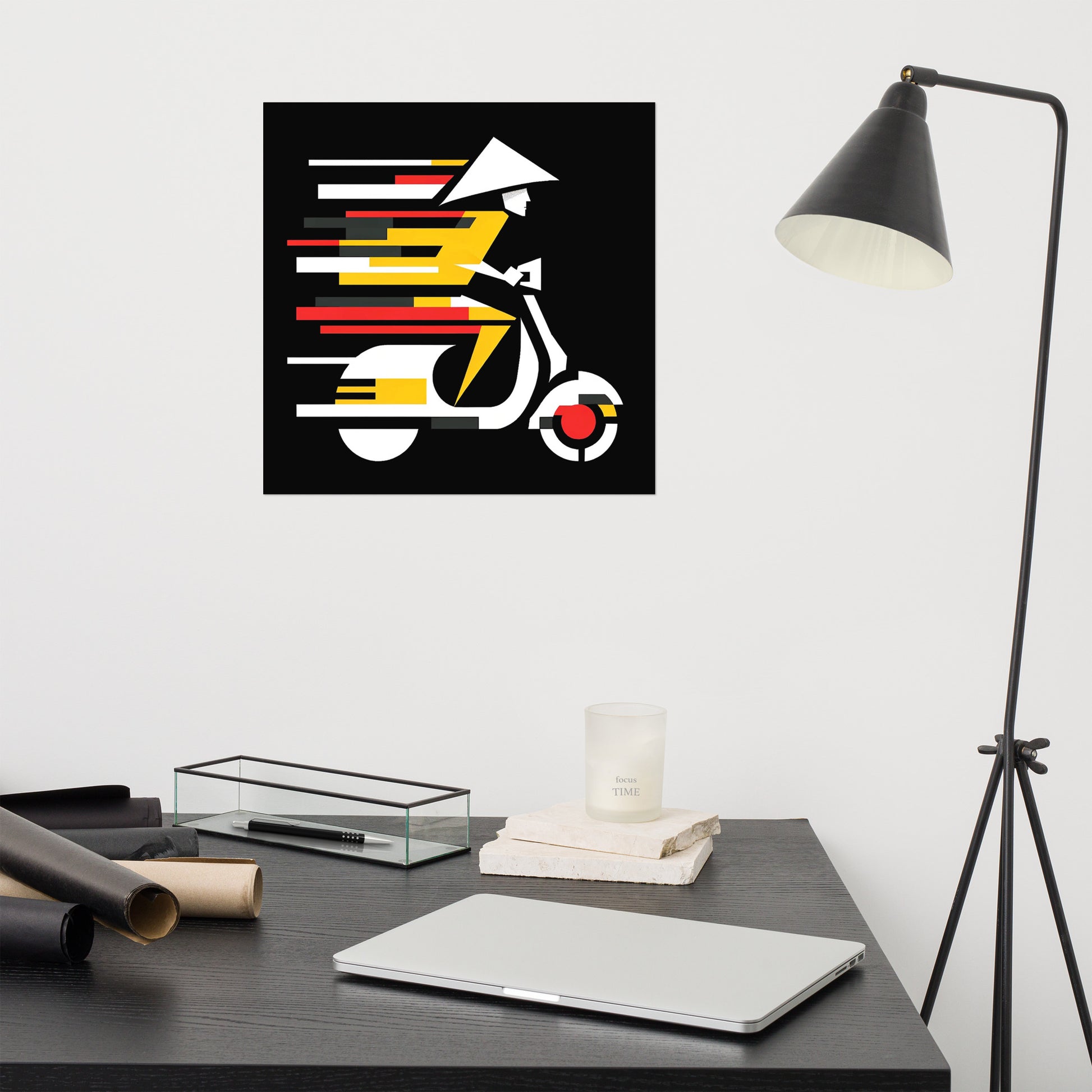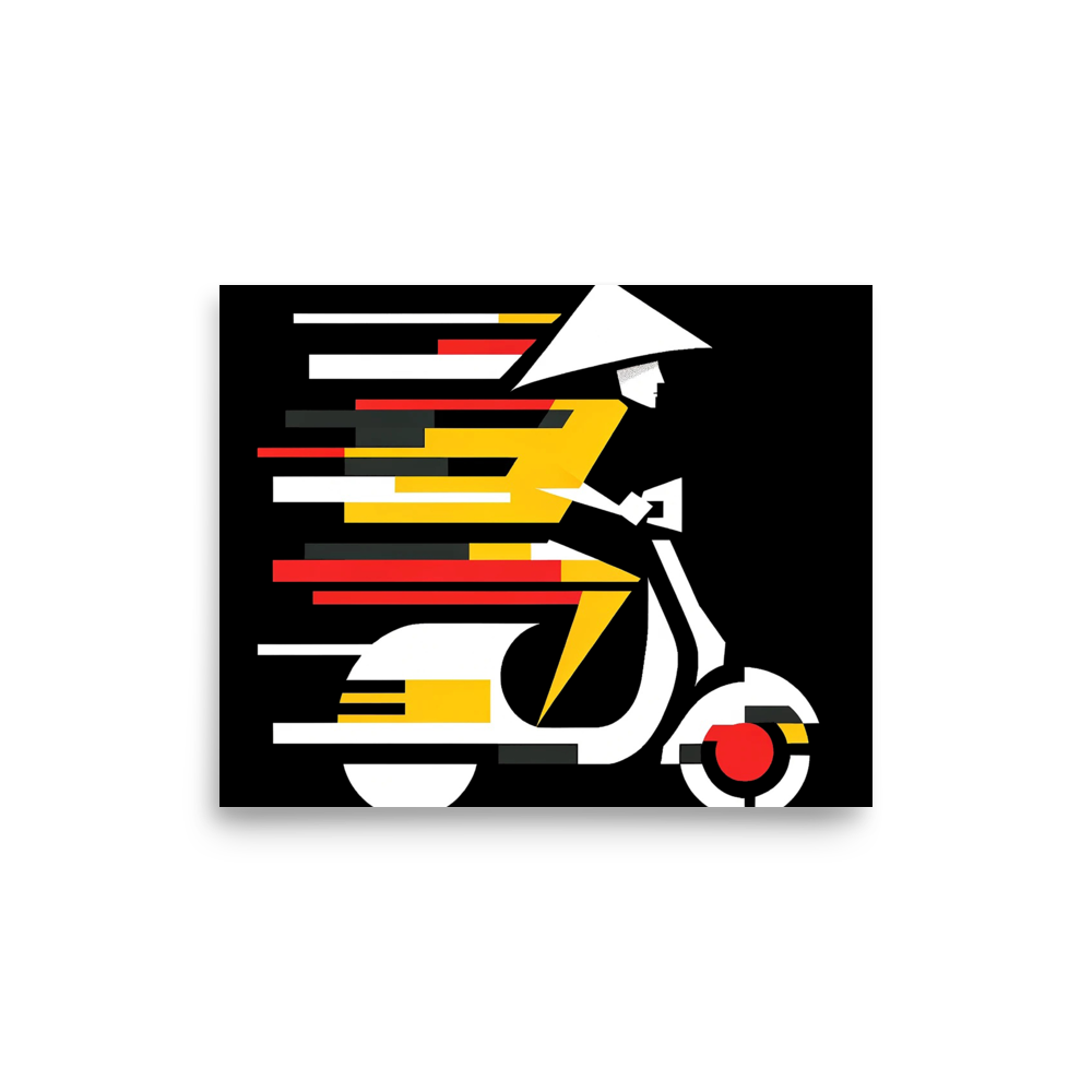 A stunning, abstract design that embodies the vibrant spirit of Vietnam! This unique artwork features a minimalistic portrayal of a man riding a scooter, a quintessential Vietnamese scene, topped with the iconic "nón lá" (conical hat).